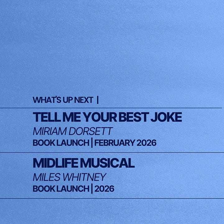 We’re proud to launch Tell Me Your Best Joke by Miriam Dorsett, a sharp and heartfelt exploration of humor as a bridge between people. Soon after, Midlife Musical by Miles Whitney takes the stage—a deeply resonant work about grief, resilience, and the ongoing journey of finding oneself in the midst of change.